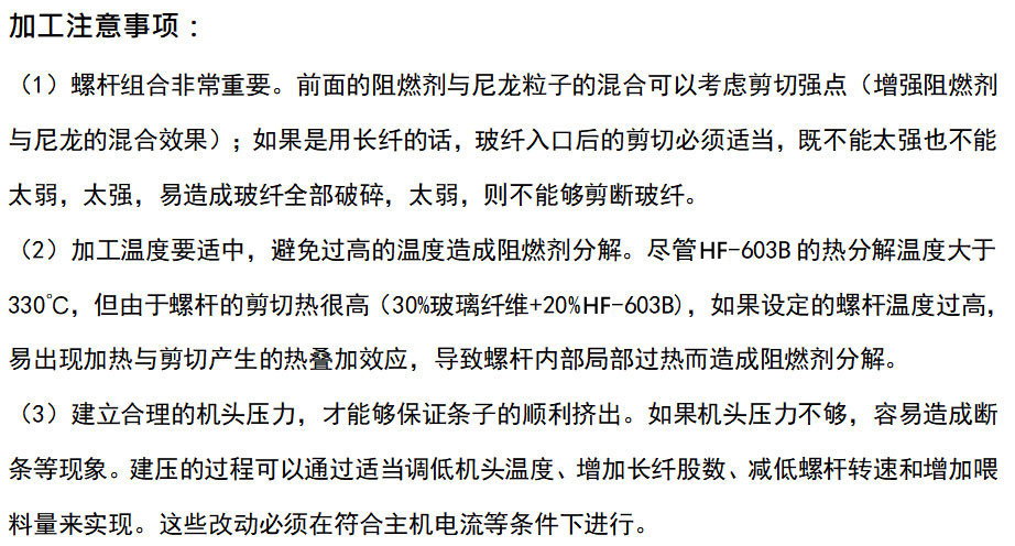 HF-603B玻纖增強(qiáng)PA6,66設(shè)計(jì)。以成炭、氣相阻燃機(jī)理起到阻燃作用。以HF-603B阻燃的玻纖增強(qiáng)PA6,66,阻燃達(dá)到UL94 V-0(1.5mm)并通過850℃灼熱絲測試。