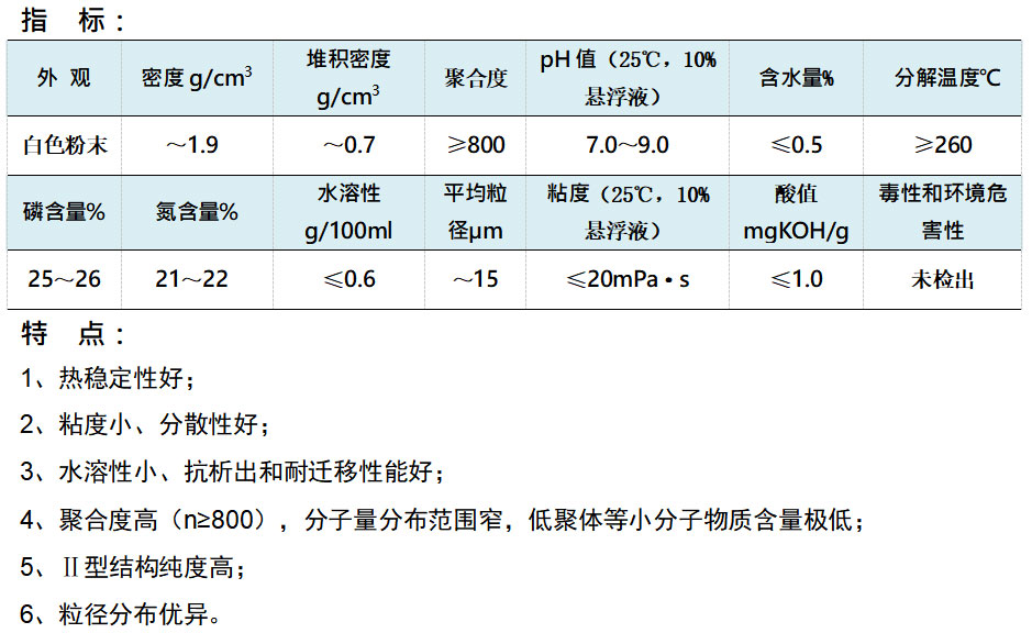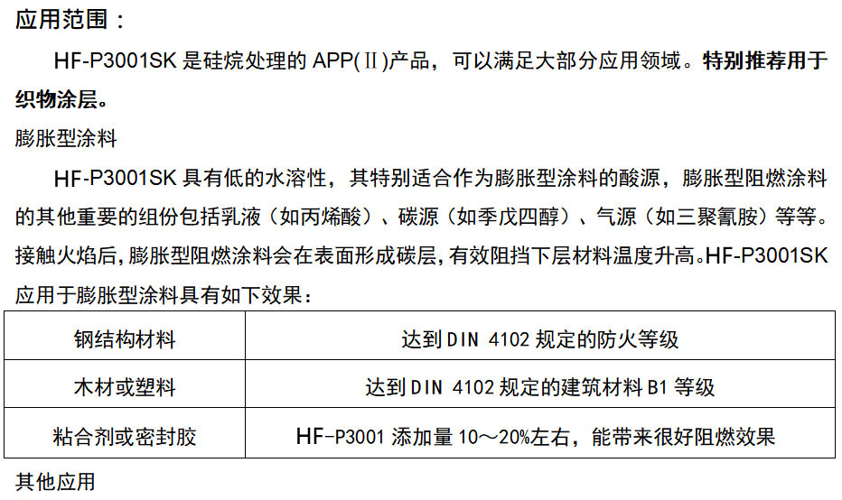 聚磷酸銨APP(Ⅱ) 為磷氮系膨脹型無機(jī)阻燃劑。其中HF-P3001SKK是一款硅烷處理的高聚合度結(jié)晶Ⅱ型聚磷酸銨產(chǎn)品。該產(chǎn)品P、N阻燃元素含量高,熱穩(wěn)定性好,近乎中性,無毒低煙。配合其它氣源、碳源,以成炭、膨脹機(jī)理起到阻燃防火作用。